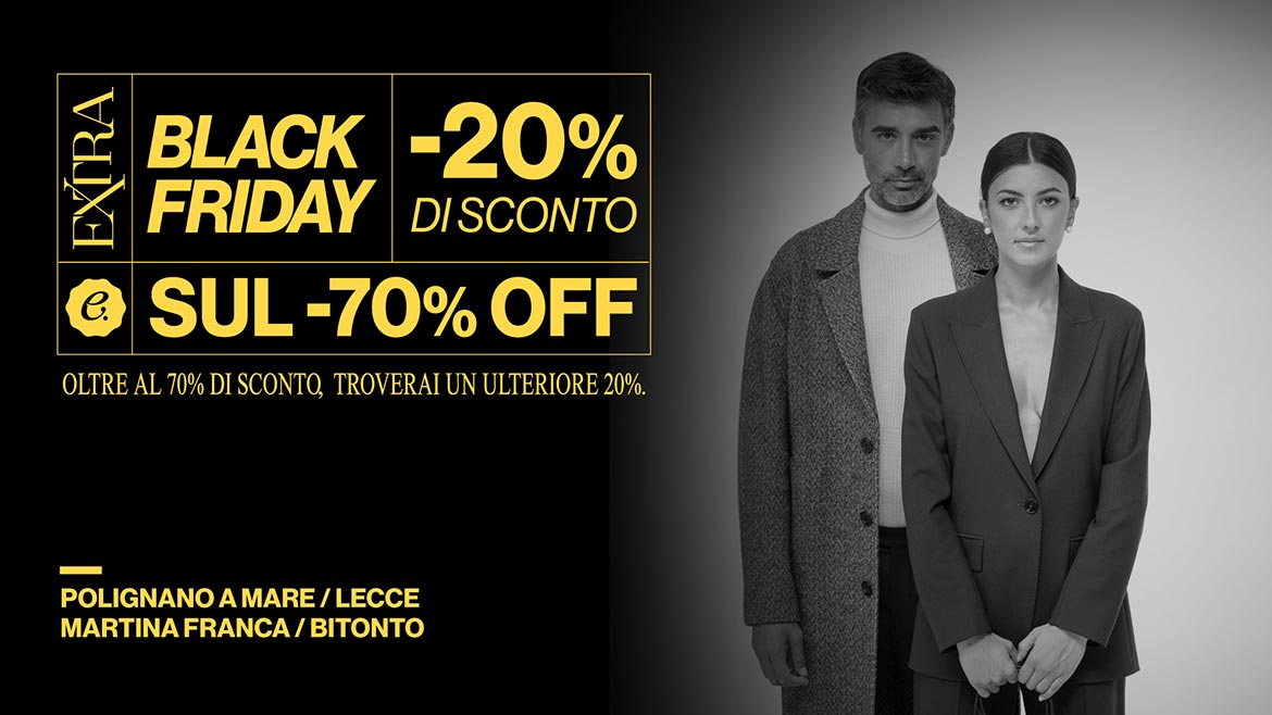 Extra identifica l’extra percentuale di sconto e l’extra offerta di capi e calzature: tutto fino al 70% di sconto, all’interno di infiniti spazi per scoprire e vestire il proprio stile, grazie alla selezione d’eccellenza che da anni ci contraddistingue.